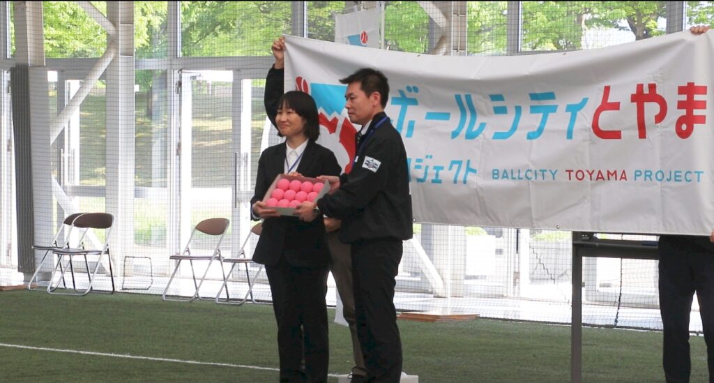 5月に富山県総合運動公園屋内グラウンドで行われたボールの寄贈式で、富山市の小学校65校にボールを2ダース寄贈しました。学習指導要領に「ベースボール型スポーツ」が含まれていることから、体育の授業で使用したり、休み時間に思い思いに楽しんでもらうことなどを想定しての取り組み。寄贈したボールは、顔にあたっても痛くない柔らかな素材で、安全にボールを投げたり捕ったりできます。